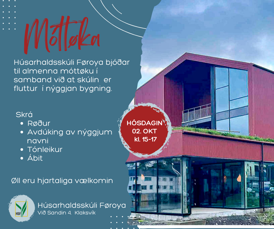 Húsarhaldsskúli Føroya bjóðar til almenna móttøku í samband við at skúlin er fluttur í nýggjan bygning.